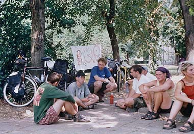 vreću, garderobu itd. nosili smo na biciklima; Prešao sam biciklom oko 940 km, ne računajući put od Beograda do Bele Crkve oko 90 km. Učešće sam platio za 14 dana po 3 dem, ukupno 42 dem. Troškovi prevoza do uključenja i povratak kući refundirani su učesnicima. Imali smo puno sunčanih dana. Samo jedan ili dva dana je padala kiša. Medjutim ni prevelika toplota ni kiša u toku dana nas nije sprečila da prelazimo dnevno po 40 - 80 km. do konačnog cilja. Bilo je teških uzbrdica i lošeg puta, ali sve to nije moglo da pokvari zadovoljstvo koje nas je motivisalo dok smo prolazili kroz predivne predele. Medju najneobičnijim učesnicima bili su: Rumun Marjan, koji je vozio "kontraš" star preko 30 godina, Poljak Marćin frutarijanac ili mala krhka Rumunka Kristina. Stoički i hrabro su izdržali sve ne žaleći se. Svi učesnici su se na rastanku zahvalili na izuzetno toplom i srdačnom prijemu tokom prolaska kroz Srbiju. Za mene je ovo bio stvarno lep doživljaj i nadam se da ću i dogodine učestvovati u sledećem "BIKETOUR"-u. petak, 3. avgust Vesna i ja smo krenuli zajedno iz Beograda u 7h. Dosadan put do Kovina, a zatim lepši deo kroz Deliblatsku peščaru i sve manje saobraćaja. Dobro je što smo poranili, jer je u podne sunce već nemilice pržilo. Čuo se orkestar zrikavaca, kao znak da je temperatura vazduha prešla 3O C. Pred kraj puta naišli smo na šumsko gazdinstvo. Gusta šuma je bila pravo osveženje. Na devedeset i nekom kilometru od Beograda zastali smo da se osvežimo u kampu "Oaza" pored jednog od belocrkvanskih jezera. Ovde se kupaju meštani, jer je to jezero najčistije, a i nema gužve. Nedaleko odatle prešli smo u drugi kamp "Jezero". To je drugo jezero na ulasku u Belu Crkvu sa daleko više posetilaca i bogatijim pratećim sadržajem (restorani, kafići, bungalovi itd). Tu smo zatekli direktora i obavestili ga o dolasku biketoura. Javili smo Nemanji u Sremskoj Kamenici da smo stigli. U međuvremenu smo se okupali u jezeru i kad smo pošli nazad u kamp naišla je mala grupa biciklista. Viki i Rajko su predvodili goste Martina i njegovu devojku Hineke iz Holandije, ostatak grupe je kasnije krenuo, a i na granici je bilo nekih problema sa vizama. Nemanja se kasnije javio i rekao da malo kasni, jer još priprema propagandni materijal. Konačno u 21h i 30' stiže cela ekipa u kamp, a za njima i Nemanja. Večeru su za biketour pripremili "mladi izvidjači" koji su takođe bili u kampu. Posle večere prisustvovao sam radnom sastanku (evening circle) i uobičajenom upoznavanju sa novopridošlim učesnicima.